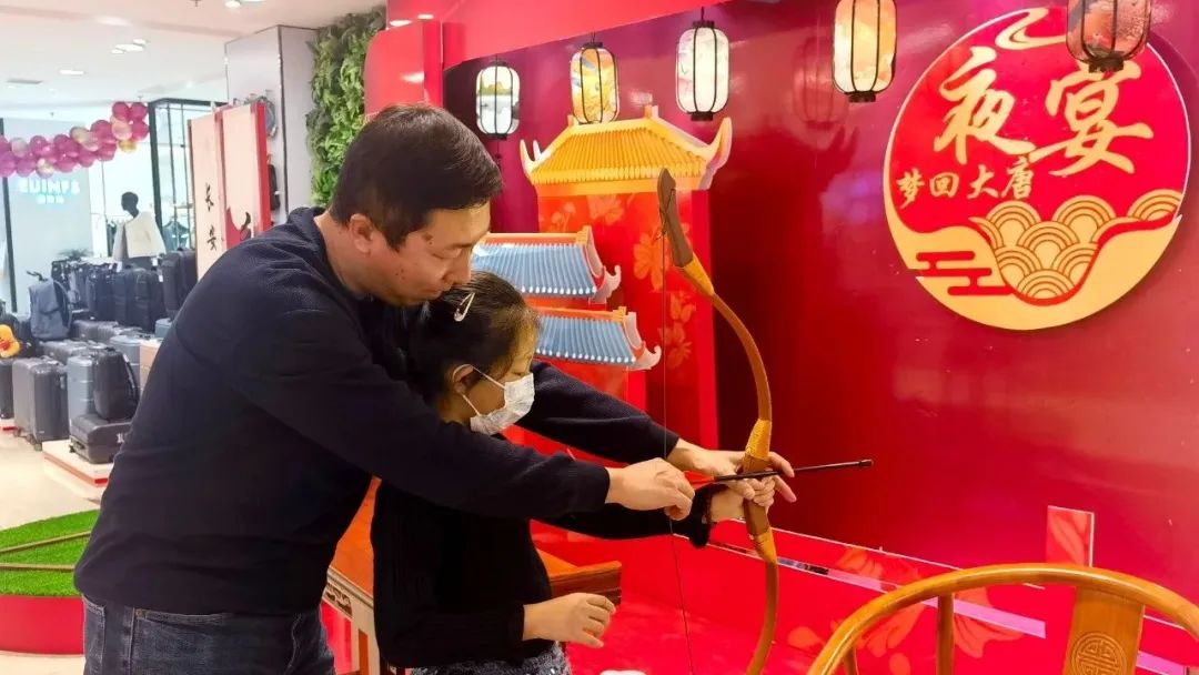 门店特邀唐宫乐师与甜蜜舞姬穿越至夜宴现场,现场演绎《唐乐十二时间》《大唐燕乐》《长安百艺》等,让主顾们品味穿越千年时光的盛唐风范。“李白”“上官婉儿”等人物穿梭于阛阓中,邀主顾共赴盛唐宴会。同时,阛阓各层开展二次元宅舞演绎,让新潮与古韵交汇,汉服与兽装齐现,带来时空交织的梦幻奇境,为夜宴增添别样风情。